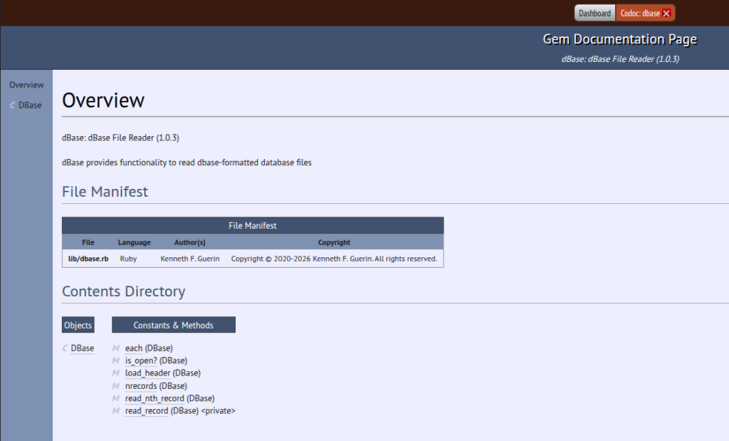Viewing a codoc docpkg documentation set will reveal its initial Overview page in its own tab. The overview contains a file manifest of all files within the library or gem or other multi-file organizational construct. The contents directory will contain a manifest of g-block items and l-block items, each clickable to open a more detailed page. On the sides of all pages in the documentation set is a sidebar which allows for easier page navigation.