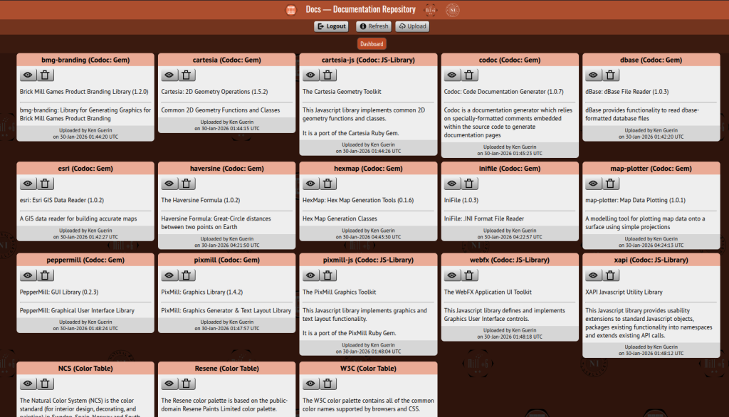 Like the other applications that I’ve written developed, the Docs application is built within the Crux application framework. It is a storage and serving methodology for documentation sets. It currently supports two types of documentation: codoc doc packages and color tables.