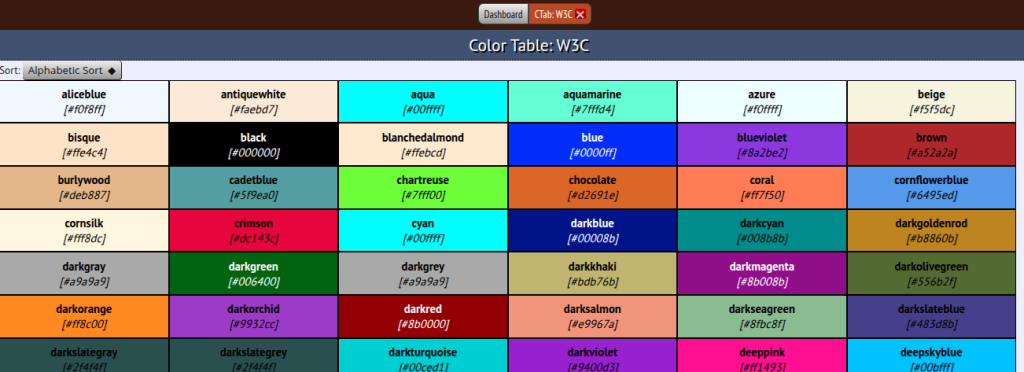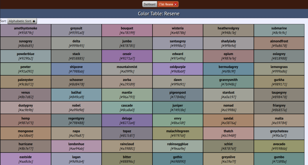 The ability to browse named colors within a palette is an important tool to have on hand. The Docs application can store color table specifications and allow the user to browse that table. Not shown, but implied by the sorting button in the upper left of the image, is the ability to do color sorting around a particular color by selecting an option with the menu button or by clicking on a color entry within the table.