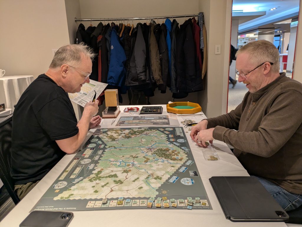 Meanwhile, the other OHH efforts are bearing fruit. If things keep trending, the game should be published this summer. In the primary playtest, the Allied team heading towards one of their rare victories and the team’s focus now is on production issues. The secondary playtest team, meanwhile, is struggling to work around their every-other-two-weeks schedule and the weather pattern we’re in. As that team is able to play from mid-afternoon into the late evening, we can cover quite a bit of ground. It’s just that the scheduling has been difficult.