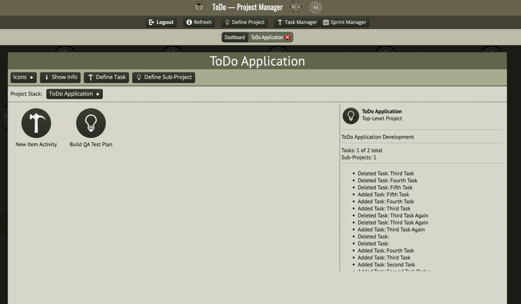 The image above shows the work in progress, where I’ve created a ToDo Application project to manage and have added some sub-projects and tasks. An activity log on the right hand side shows some testing I’ve done, including some bugs where you can see that I’ve had to delete the same task more than once.